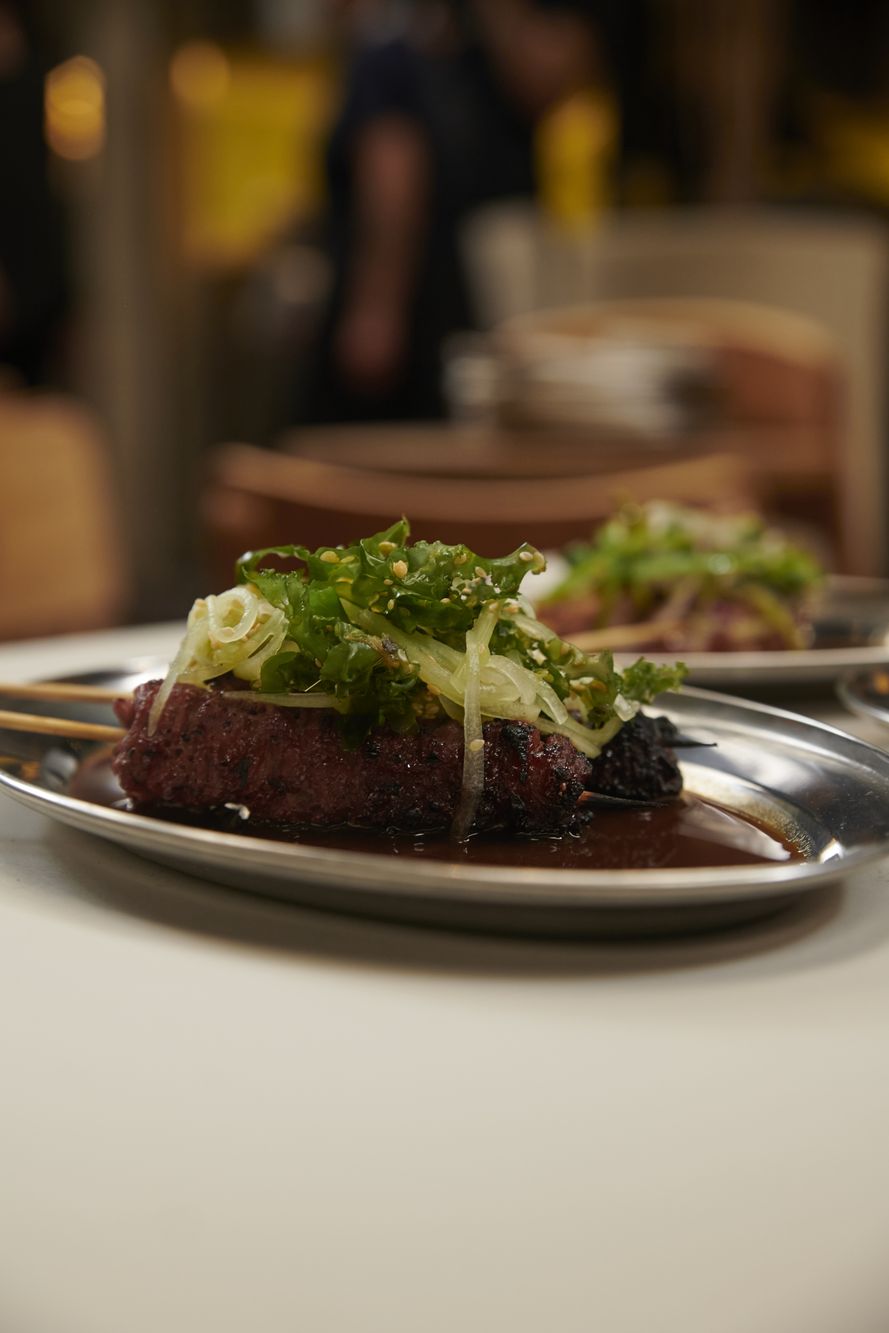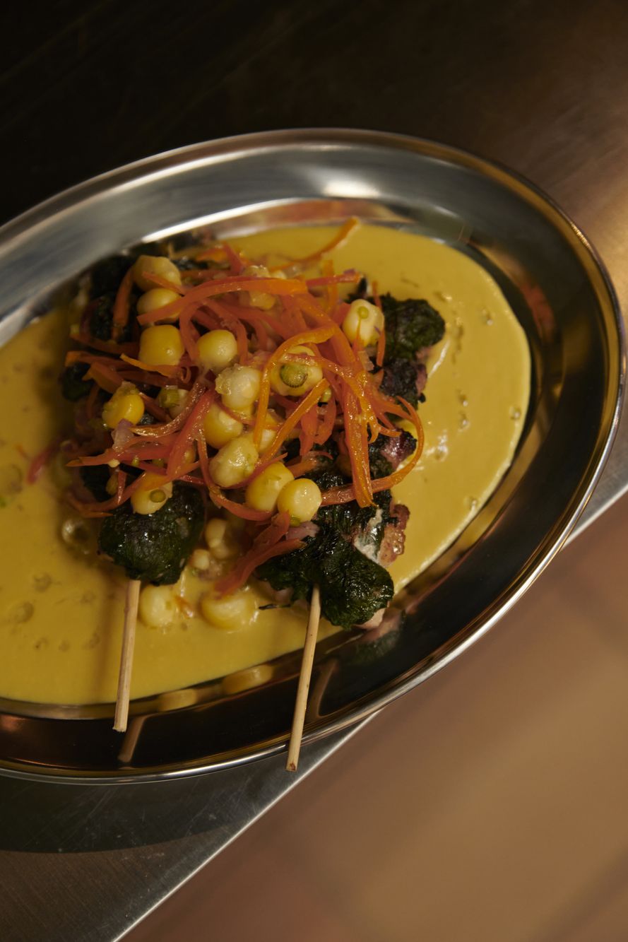 - Pinchos de res: 2 pinchos de res con tortilla de yuca y demiglace de res acompañados de 2 porciones de papas criollas confitadas con suero costeño.