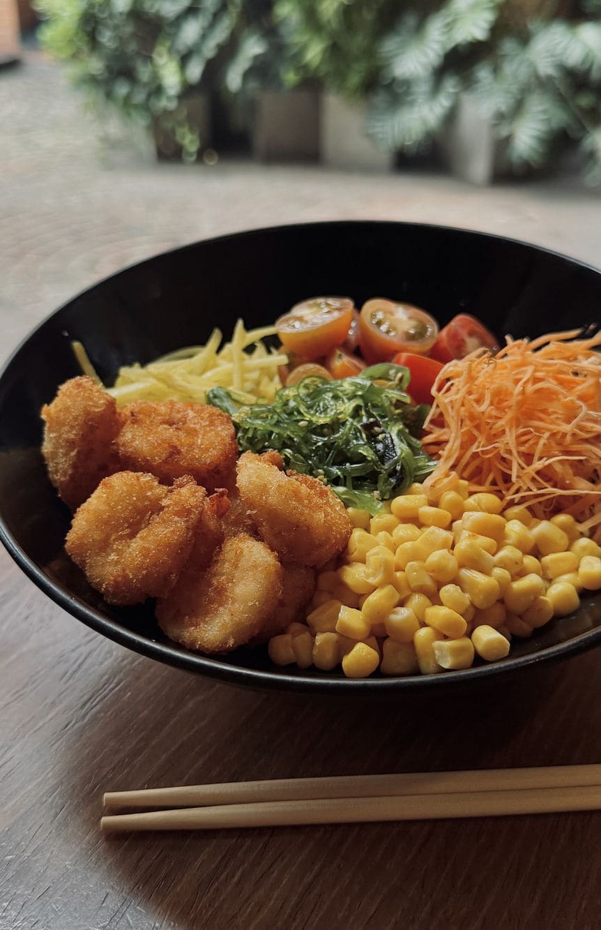 - Camarón poke: Camarón crispy, tomates cherry, wakame, mango biche, maíz tierno, hilos de zanahoria con mayo chipotle en base de arroz.