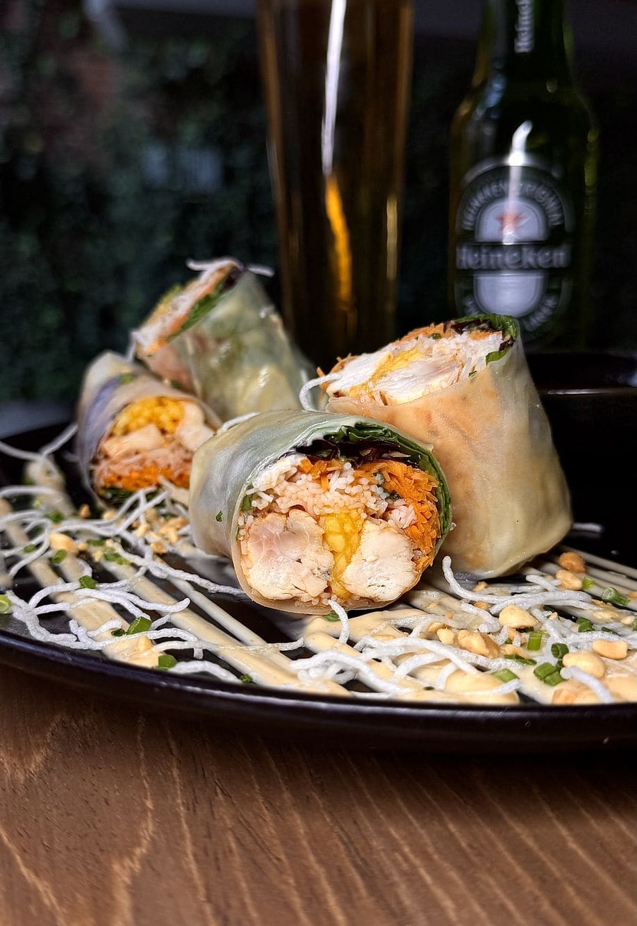 - Rollitos vietnamita: En papel de arroz, rellenos de pollo, mango, zanahoria, maní con mayonesa de wasabi y salsa agridulce de pimentón.
