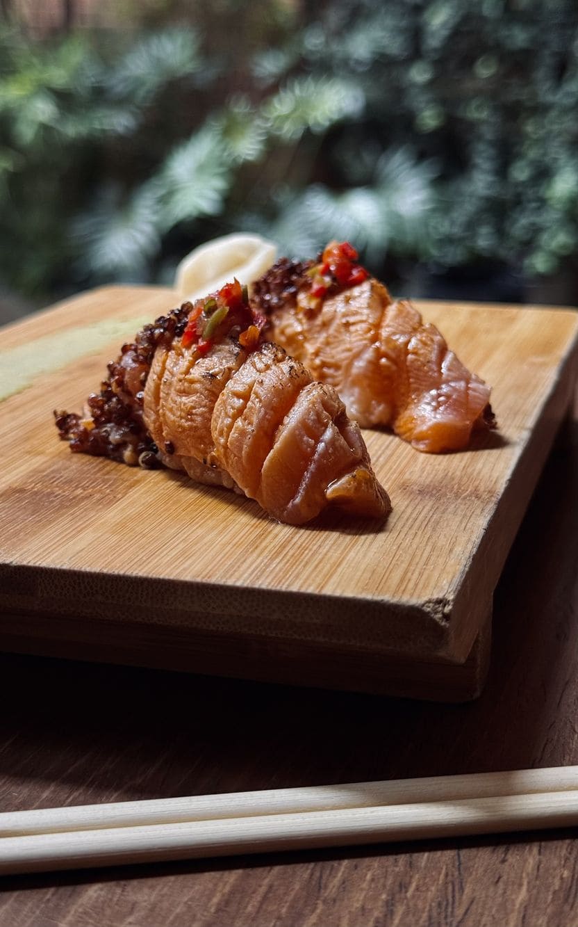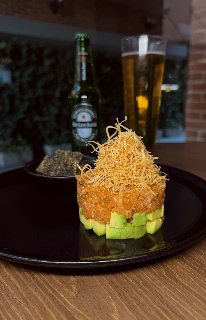 - Tartar de salmon: Con aguacate, masago, aceitunas verdes, alcaparras en base de quinoa crocante, mayonesa de ajos y cilantro, vinagreta oriental, acompañado de galletas de alga nori.