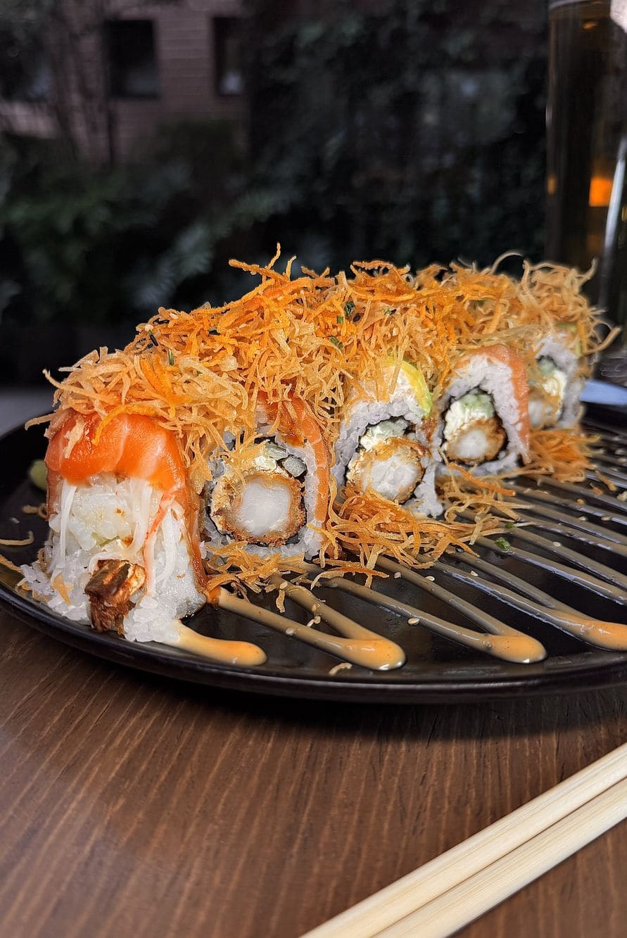 - Ebi kani crunch roll: Langostinos tempura, queso crema, pepino, tope de ensalada kanikama, salmon, aguacate, hilos de masa filo, zanahoria crocante, salsa de anguila y mayo spicy.