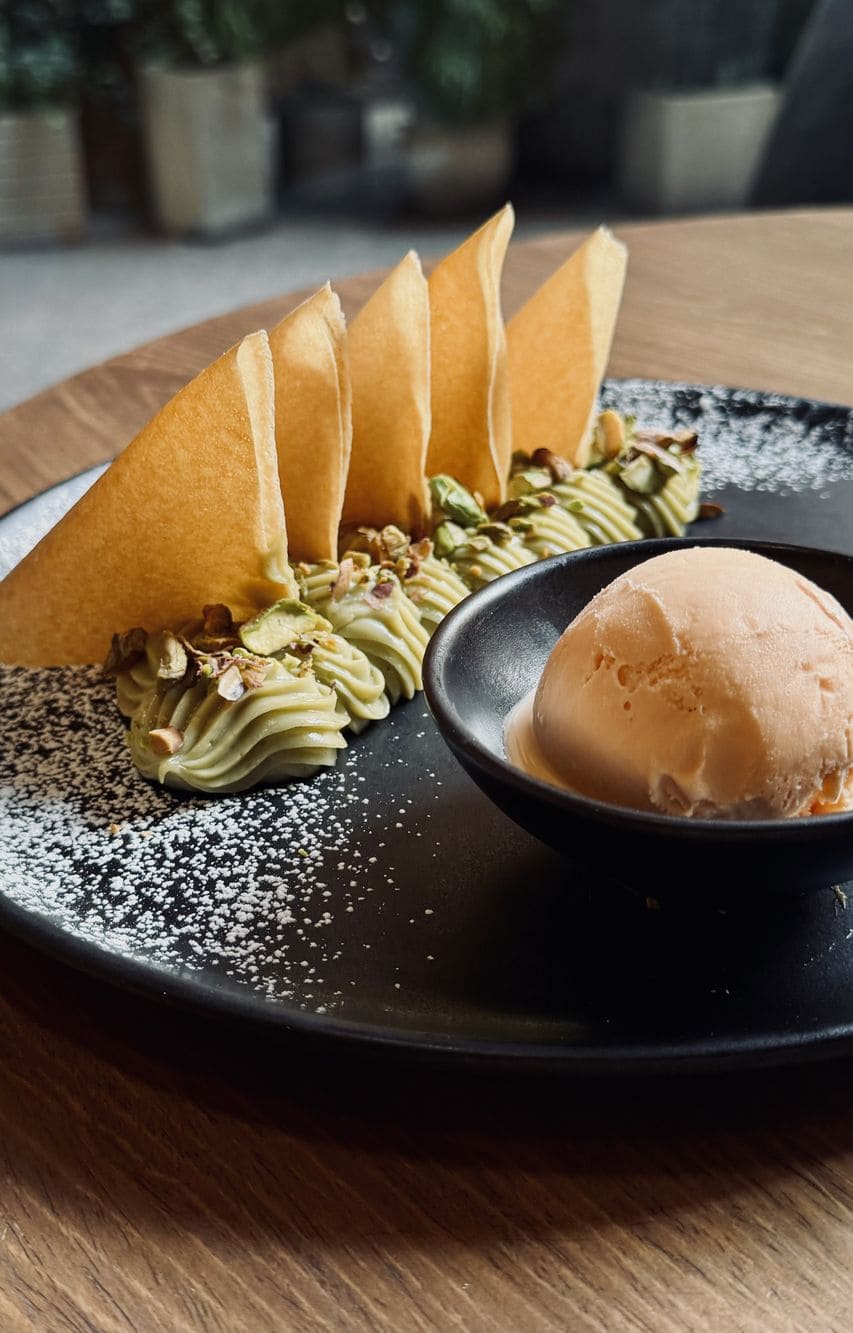 - Cremoso de te matcha: Con pistachos y helado de mandarina