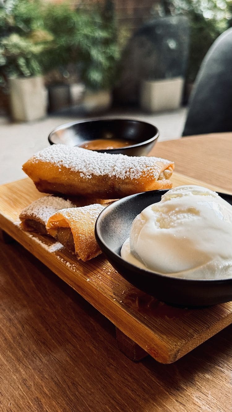 - Rollos de banano: Con salsa de chocolate o caramelo y helado de vainilla